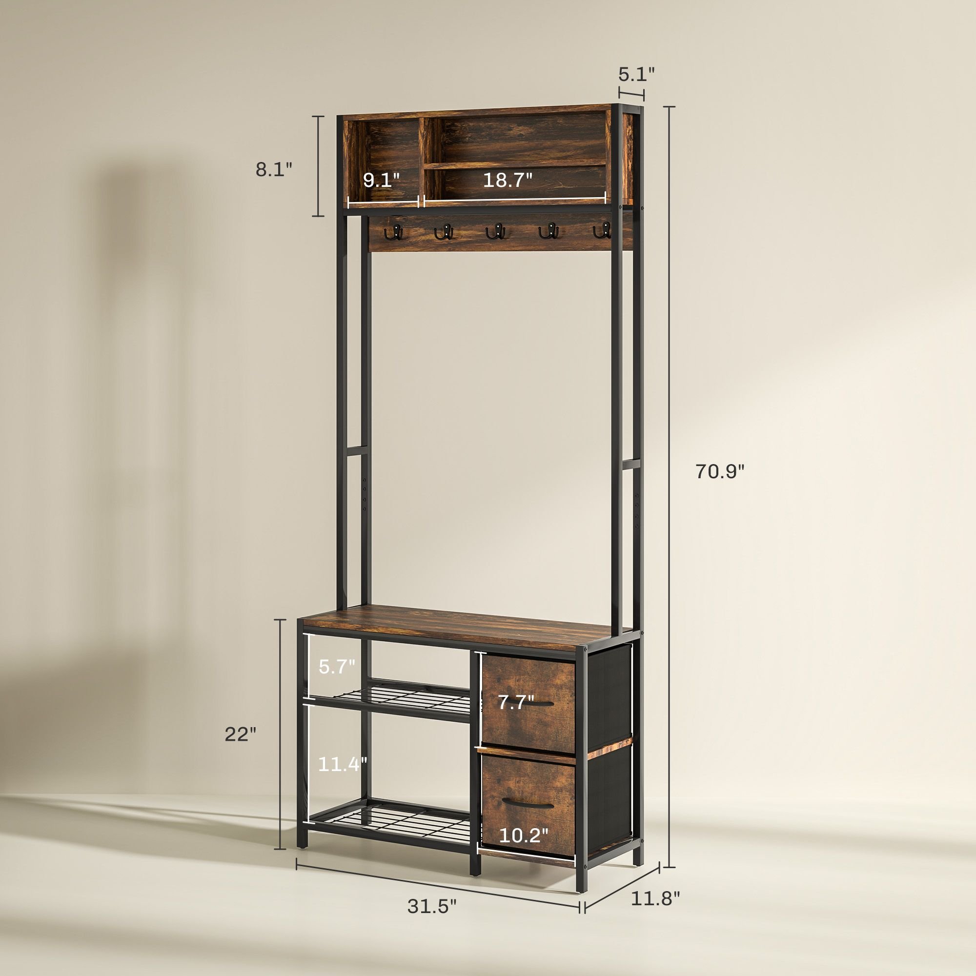 5.- Entryway Coat Rack Information: Overall dimension: 31.5" L x 11.8" W x 70.9" H. Weight capacity: 300 lbs. (seat), 17.6 lbs. (each shelf), 6.6 lbs. (drawer). Assembly required