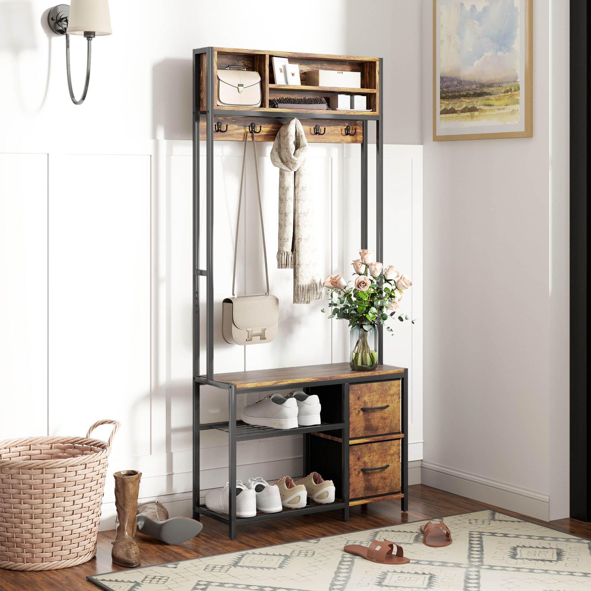 1.- 5-in-1 Design: This hall tree integrates coat hooks, a bench, a shoe rack, storage open compartments, and fabric drawers to make the most of your space and create a neat and practical entryway
